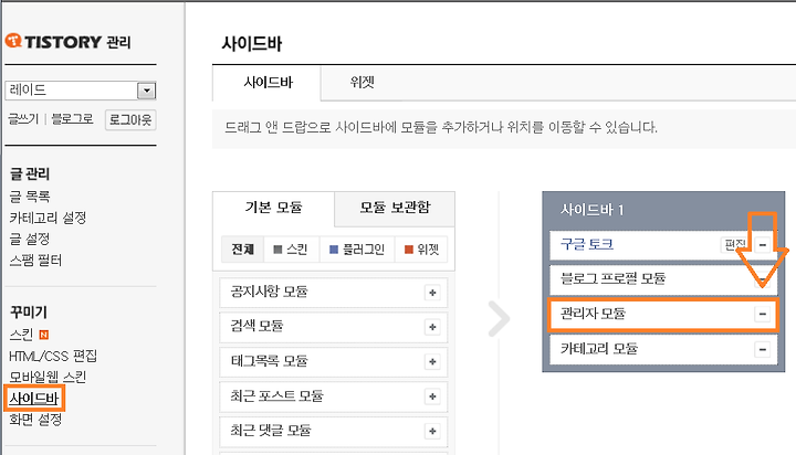 그럼 이제 티스토리 사이드바에서 관리자 모듈을 제거해보도록 하겠습니다.